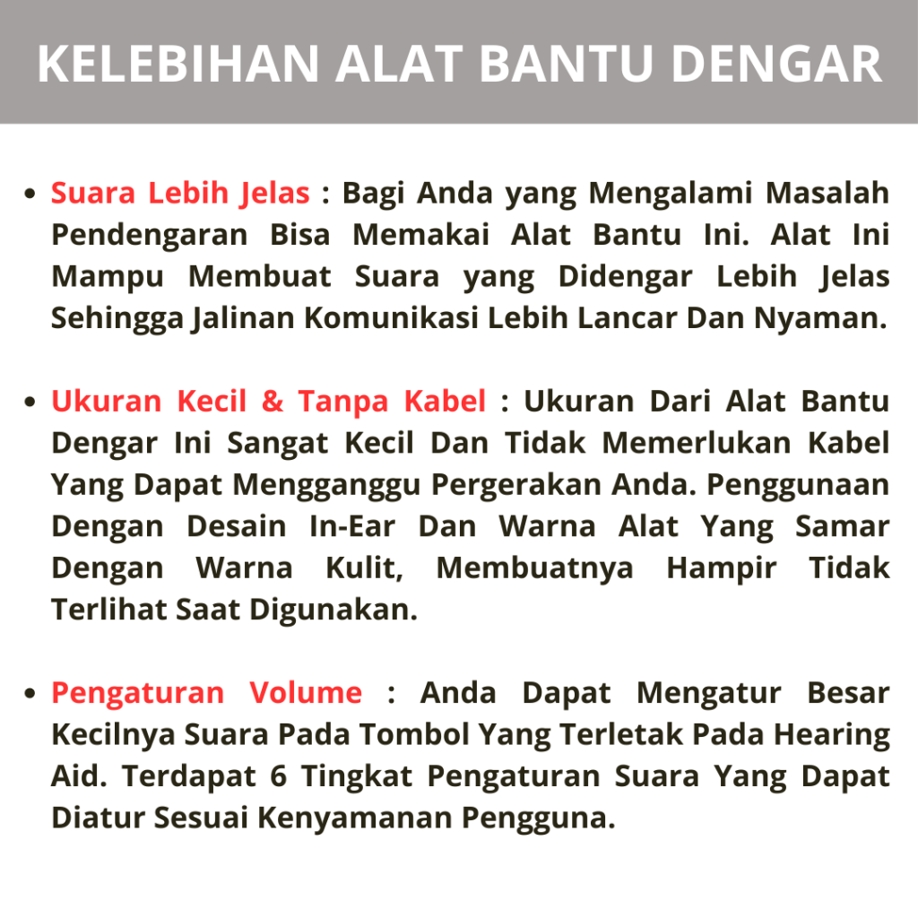 Alat Bantu Dengar seperti Earphone, menggunakan Teknologi Amplify Sound yang memungkinkan anda dapat mendengar suara menjadi lebih jelas dan tajam, sehingga jalinan komunikasi lebih lancar & nyaman